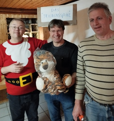 Alexander Schweitzer setzte sich souverän im Trienens-Spiel auf der Weihnachtsfeier 2024 durch. Mike überreichte den Tiger an den glücklichen Gewinner.
